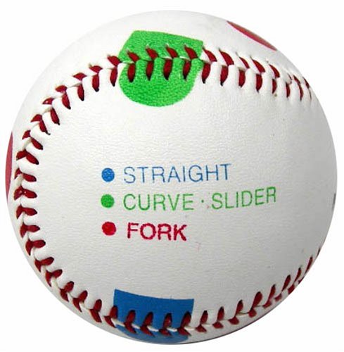 変化球の握り方が練習でき硬式タイプのボール。ストレート、カーブ、スライダー、フォークボールの握りを確認しながら投球練習ができる。キャッチボール専用。